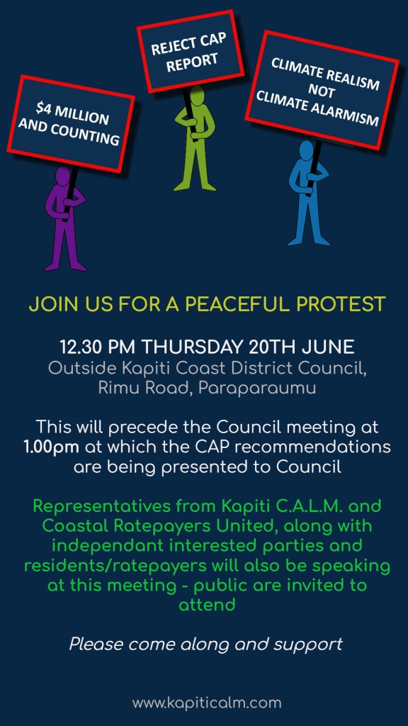 We have been tireless in our goal of calling out flawed scientific data and flawed community engagement used in the Takutai Kapiti/CAP project. We refuse to accept the SSP5-8.5 and RCP8.5H+ extreme modelling which even the IPCC (Intergovernmental Panel for Climate Change) has admitted is implausible. CALM will continue to campaign for real data + real science + real answers to give calm outcomes and hold back the tsunami of climate alarmism which will see our properties devalue and hazards noted on LIMs. It will also add to more mental anguish for our community when we are already dealing with rising living costs.