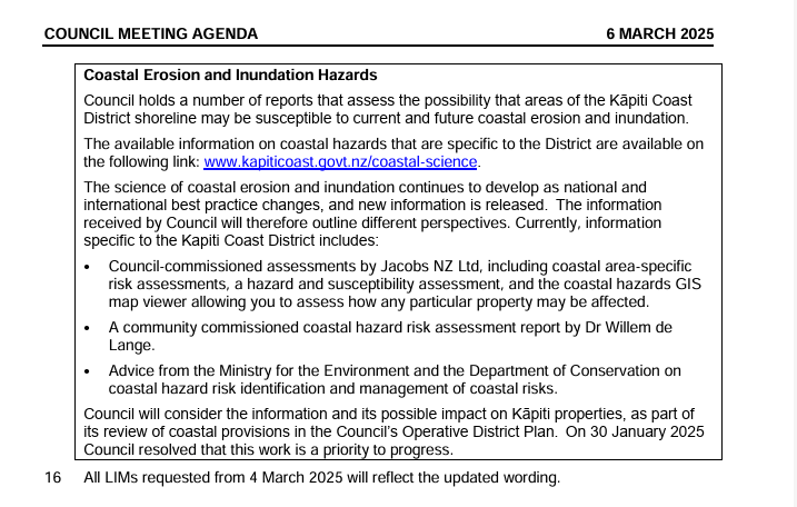General LIM notifications were based on extreme Jacob’s modelling (using RCP 8.5 sea level rise criteria), incorporated in the CAP Recommendations which cost ratepayers over $5 million. The LIM statement “Coastal Erosion and Inundation” is already impacting Kapiti property values, housing sales, insurance premiums, and causing community harm, as it informs buyers, banks, and insurers.